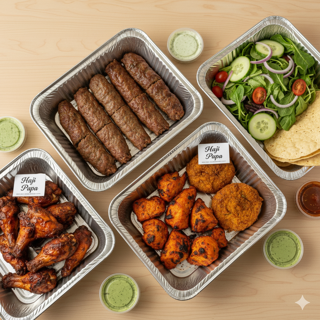 Fish Pakora, Chicken Wings, Lamb Kebab Rolls, and Chicken Tikka — with Veg Samosas, Salad & Mint Sauce.