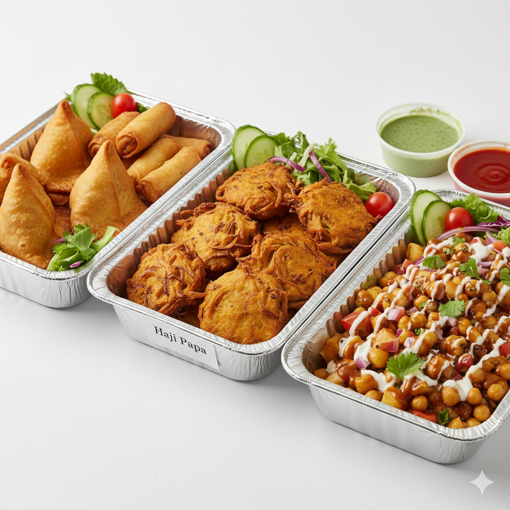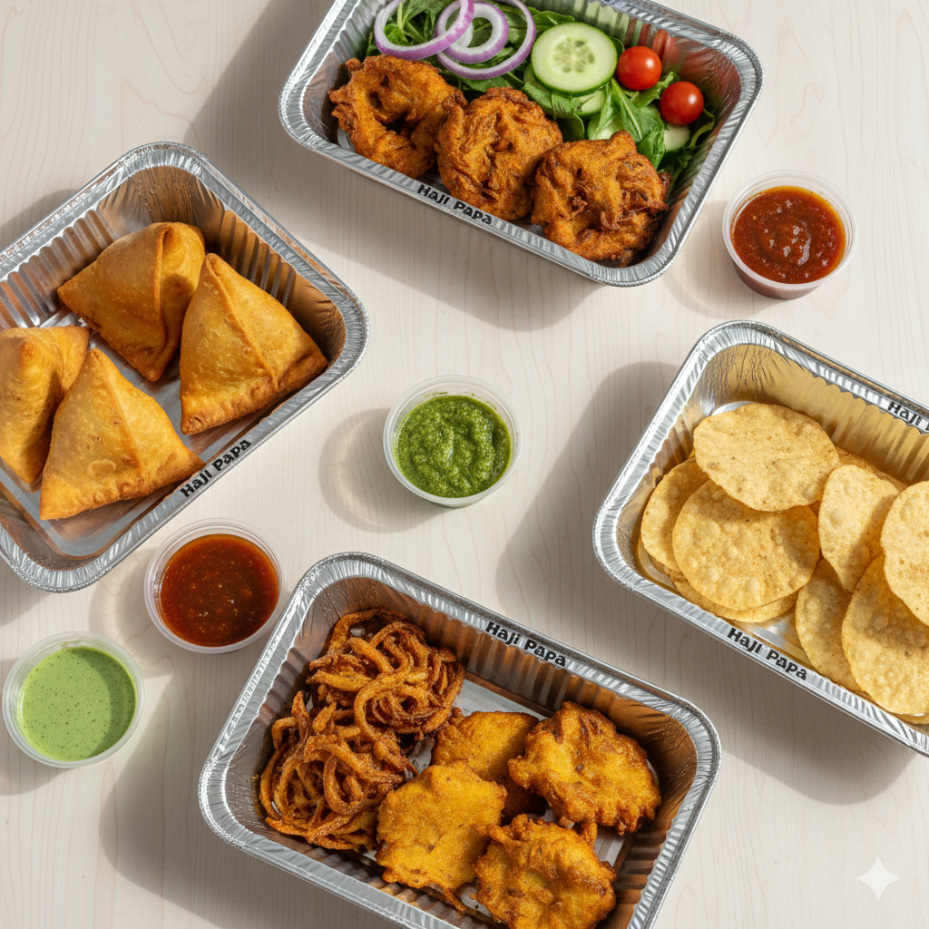 Includes Veg Samosa, Mini Spring Rolls, Onion Bhajis, and Channa Chaat — with Papadoms, Salad, Mint & Chilli Sauce.