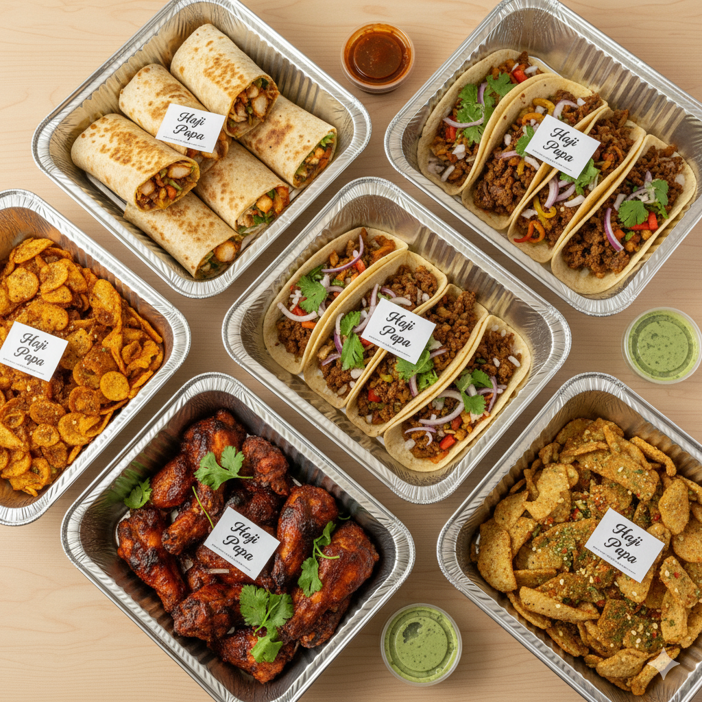 Chicken Fajita Wraps, Beef Soft Shell Tacos, Grilled Chicken Wings, Masala Chips, Veg Samosa & Salad.