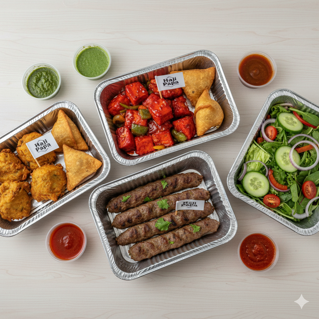 Aloo Pakora, Chilli Paneer, Veg Samosas, and Lamb Sheek Kebabs — with Mint & Chilli Sauce.